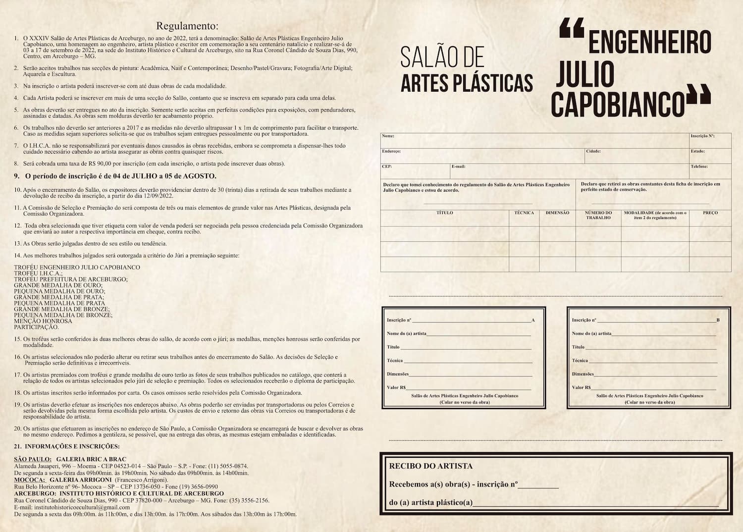沙龙来组成传统, 今年以 SALON ARTS ENGINEER JULIO CAPOBIANCO 的名字命名, 为了纪念这位艺术家诞辰一百周年. XXXIV ARCHEBURG 塑料艺术沙龙, MG, 注册已开放,可在注册表中列出的以下位置进行: