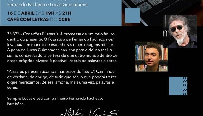 新书发布会邀请 Lucas 吉马良斯和 Fernando 帕切科: 33,333 – 双边日连接 16/04, 星期四晚上 7 点 Café Com Letras Banco do Brasil 文化中心 Praça da Liberdade, 450 – 在贝洛奥里藏特官员 – MG – 巴西邀请: . [谷歌] 和我们一起去, 获取最新通过电子邮件: 电子邮件 . . [鸣叫] . 网站obrasdarte.com: 艺术家 … 阅读更多